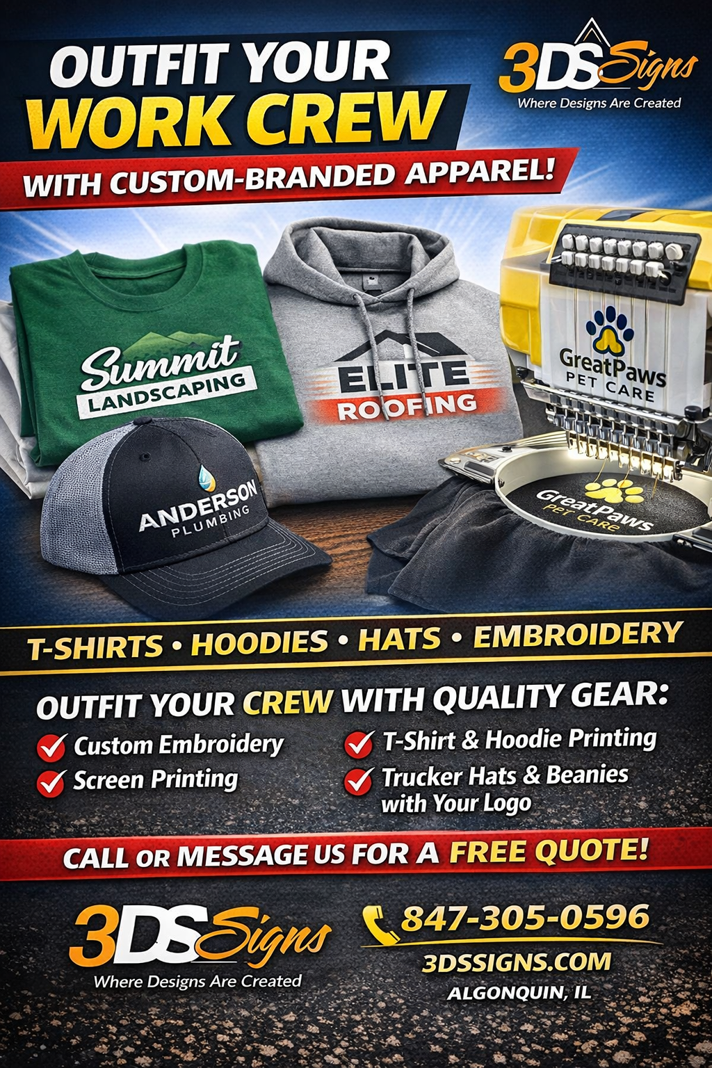 Founded in 2008 as Genes Magazine Inc., 3DS Signs has evolved into a trusted provider of custom printing, signage, and embroidery services for businesses and individuals across Algonquin, IL, and the greater Chicagoland area.